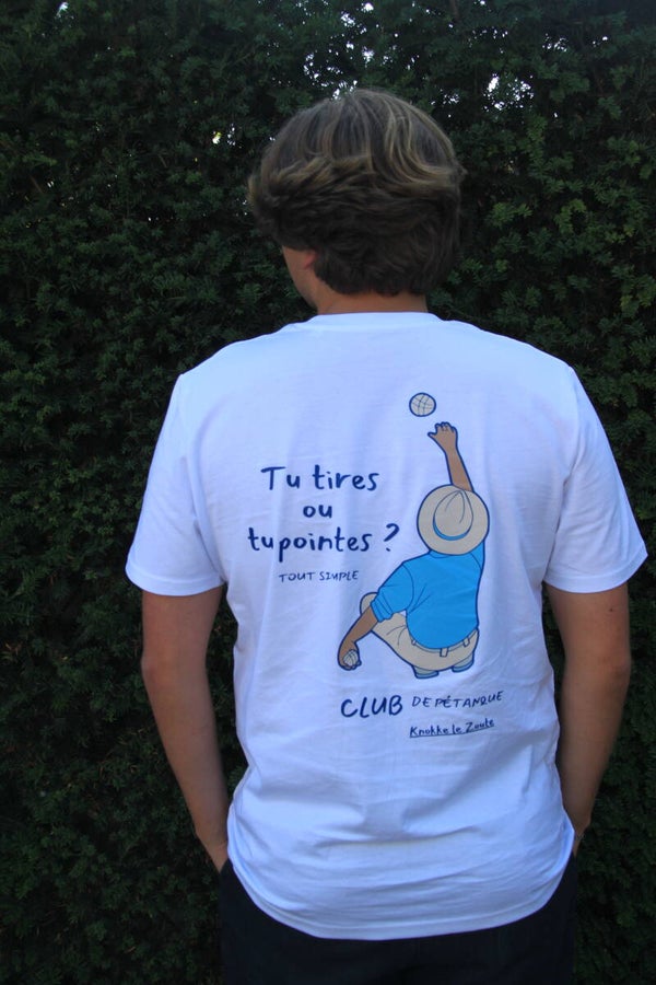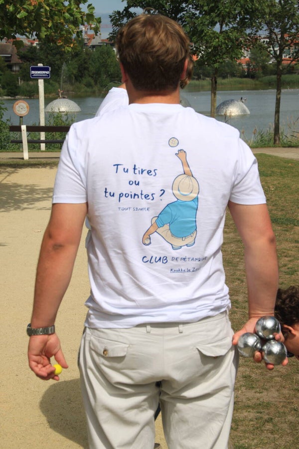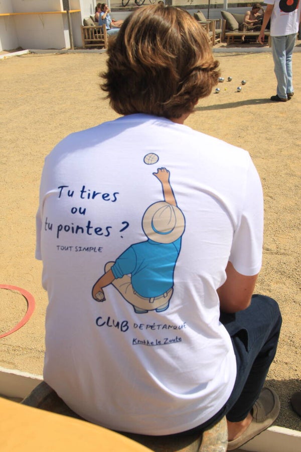 The – pétanque classic – Tee brings the spirit of friendly competition to life. With a playful illustration of a pétanque player in action and the iconic phrase “Tu tires ou tu pointes?” on the back, this soft cotton tee is made for long afternoons on the court. Perfect for anyone who enjoys the game, the camaraderie and the laid-back rhythm of summer days.