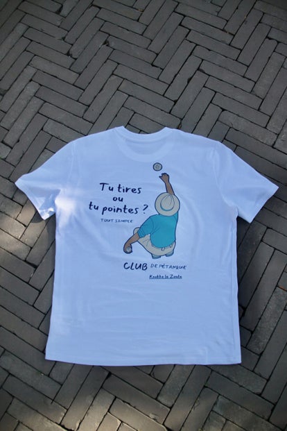 The – pétanque classic – Tee brings the spirit of friendly competition to life. With a playful illustration of a pétanque player in action and the iconic phrase “Tu tires ou tu pointes?” on the back, this soft cotton tee is made for long afternoons on the court. Perfect for anyone who enjoys the game, the camaraderie and the laid-back rhythm of summer days.